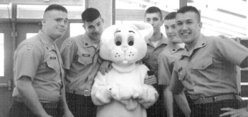 Looks like some cadets made a new friend recently. Posing with the Easter Bunny are (l-r) Danny Murtagh, Keith Allen, Michael Basjel, Nathan Newell and Alex Hutchinson. The Easter Bunny made a special stop shortly before Easter to the Academy to have lunch with the cadets and pass out treats.