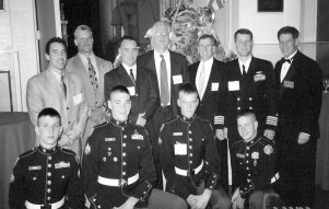 Alumni attending were (l-r) John McKenna -’83, Thomas Kolongowski -’82, Mike Mallard - ‘89, Anthony McIntyre -’75, Brian Skimmons -’76, Capt Mark W. Czarzasty, USN, - ‘76 and Craig Matteson -’79. Cadets attending the event were (l-r) Geoffrey Braun, Alberto Pina, Austin Aitken and David Krauss.